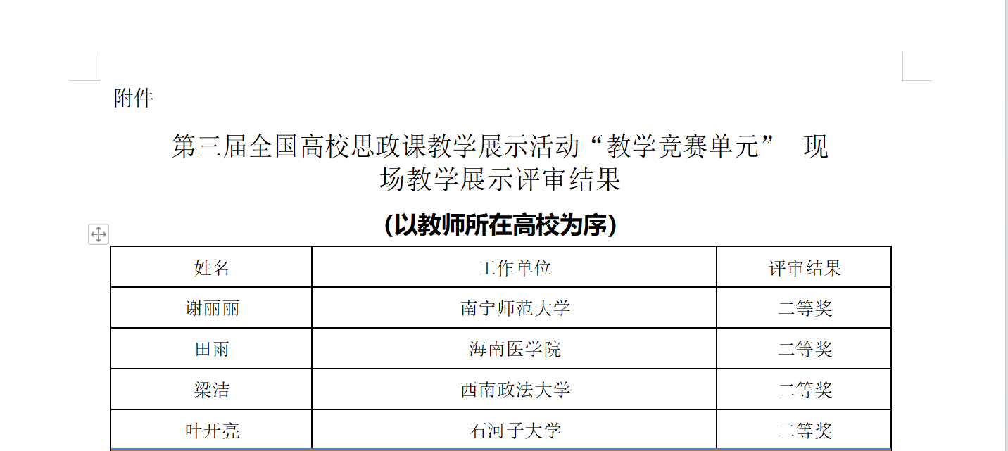 近日,教育部公布第三届全国高校思想政治理论课教学展示活动“教学竞赛单元”评审结果,公司太阳集团tyc33455谢丽丽副教授喜获二等奖。