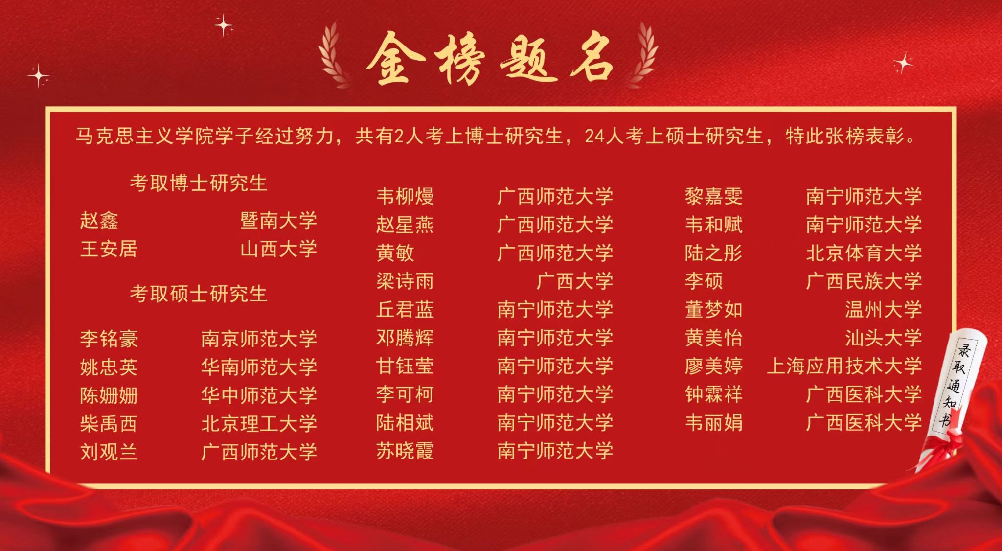 博士研究生升学考试中,赵鑫成功考入暨南大学、王安居考入山西大学,将持续深耕马克思主义理论领域研究。