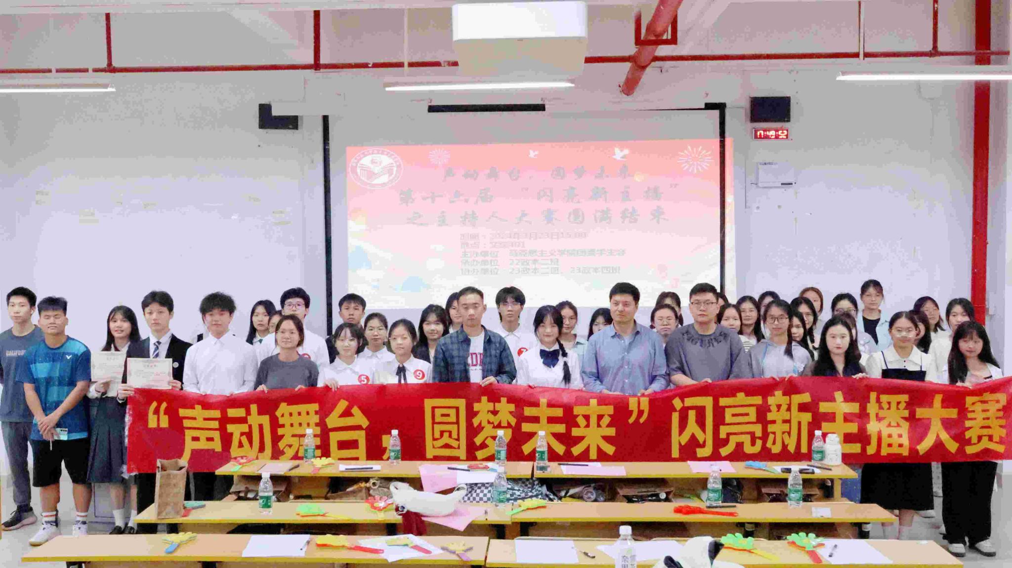 2024年3月23日下午3时,太阳集团tyc33455在文综楼401教室举办了以“声动舞台,圆梦未来”为主题的第十六届闪亮新主播之主持人大赛。出席本次大赛的评委有22政本2班班主任白雪松、兼职辅导员陆乙川、校广播站李青峰、员工会主席团骆东媛、办公室潘洁华、组织部欧阳颖、文艺部刘钰成、第十五届闪亮新主播冠军韦宇晗、第十五届闪亮新主播亚军覃鹿溪、助班助理谢雨莹以及各班大众评审、班级代表。