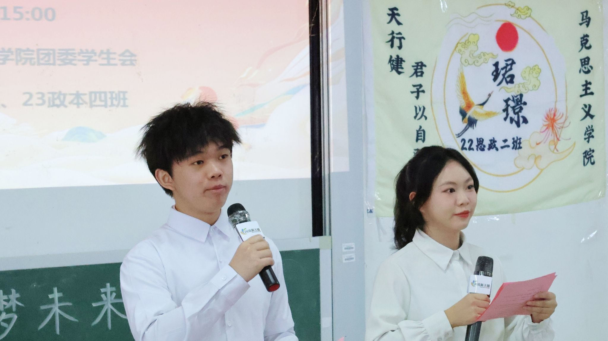 比赛伊始,艺术团成员带来开场节目《找自己》,紧接着白雪松老师作为评委代表发言,他指出,本次大赛的目的在于发掘既有深度理论积累又有实践能力的马院学子,为新时代文化传播注入新的活力,让马克思主义理论能得到进一步传播和普及。比赛过程中,参赛选手首先进行了两分钟的模拟主持,参赛选手们的选题紧跟实时新闻,表达清晰明了。随后,在配音环节中,选手们惟妙惟肖地演绎令人身临其境。在接下来的互动环节中,观众们踊跃参与,现场氛围高涨。在新闻评论的环节中,参赛选手们紧抓时政要点,侃侃而谈。比赛最后,第十五届闪亮新主播冠军韦宇晗、校广播站李青峰以及22政本2班班主任白雪松对选手进行了点评,他们肯定了选手们积极向上的精神风貌与临场发挥的能力,同时也指出了不足之处,有助于选手们提高自我,完善自我。