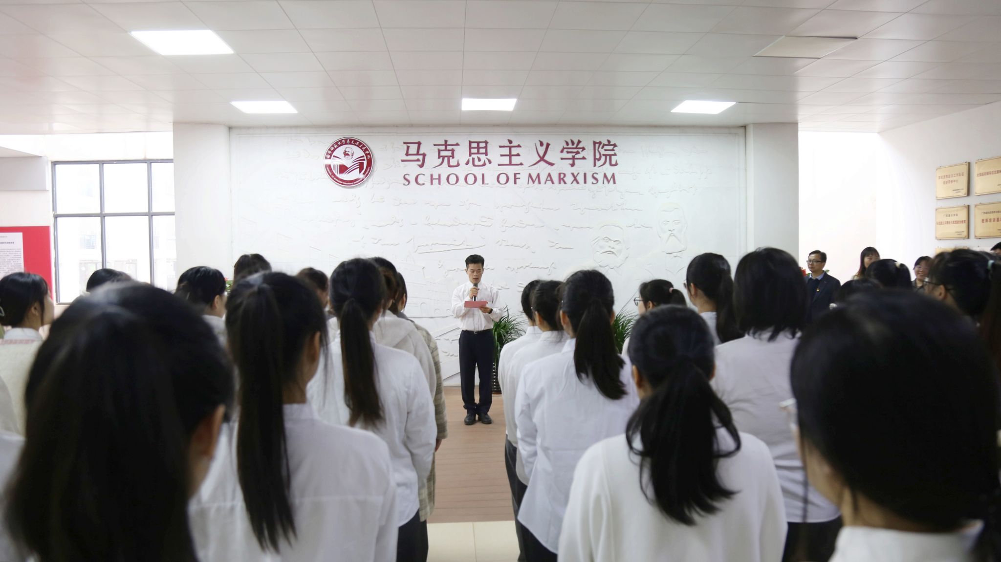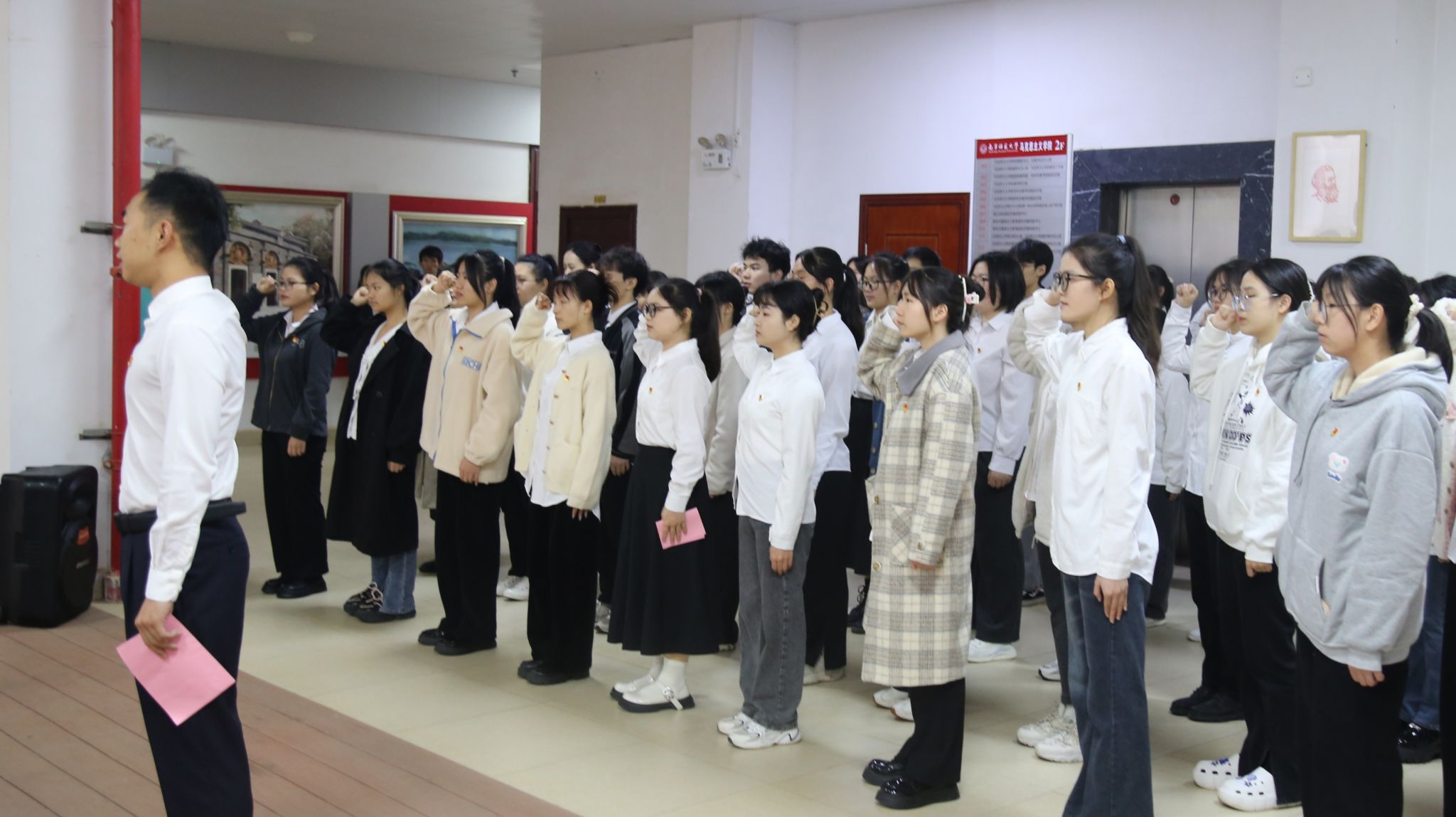 太阳集团tyc33455新发展党员入党宣誓仪式于2024年1月9日在五合校区8栋B座2楼马克思主义理论教育广场隆重举行。出席本次活动的有公司党委书记李玲、党委副书记黄志海、马克思主义基本原理研究生党支部书记姜黎黎、本科生第一党支部书记李夏阳、本科生第四党支部书记张万景、本科生第五党支部书记王玉香、辅导员黄业毅以及新发展党员们。