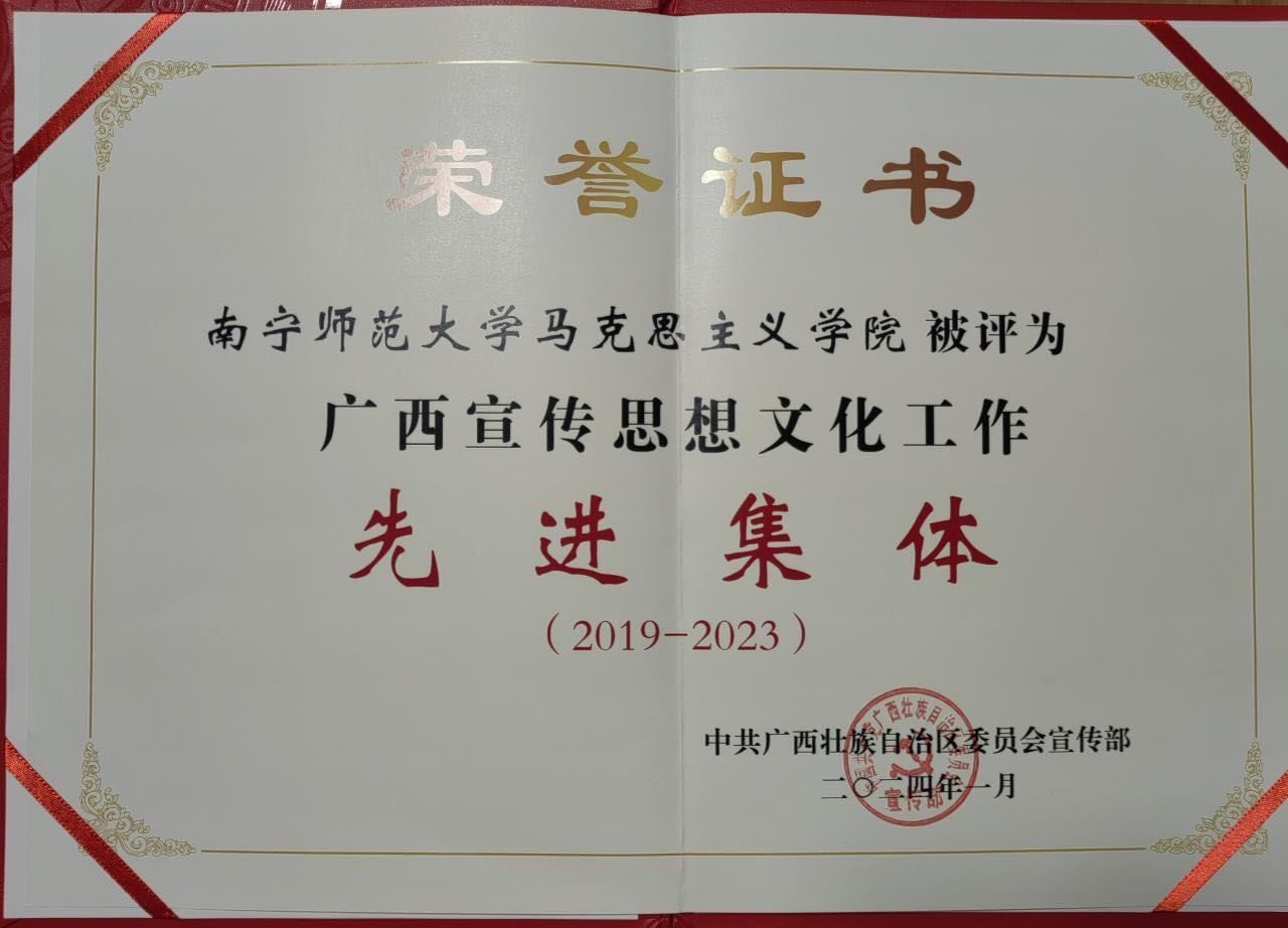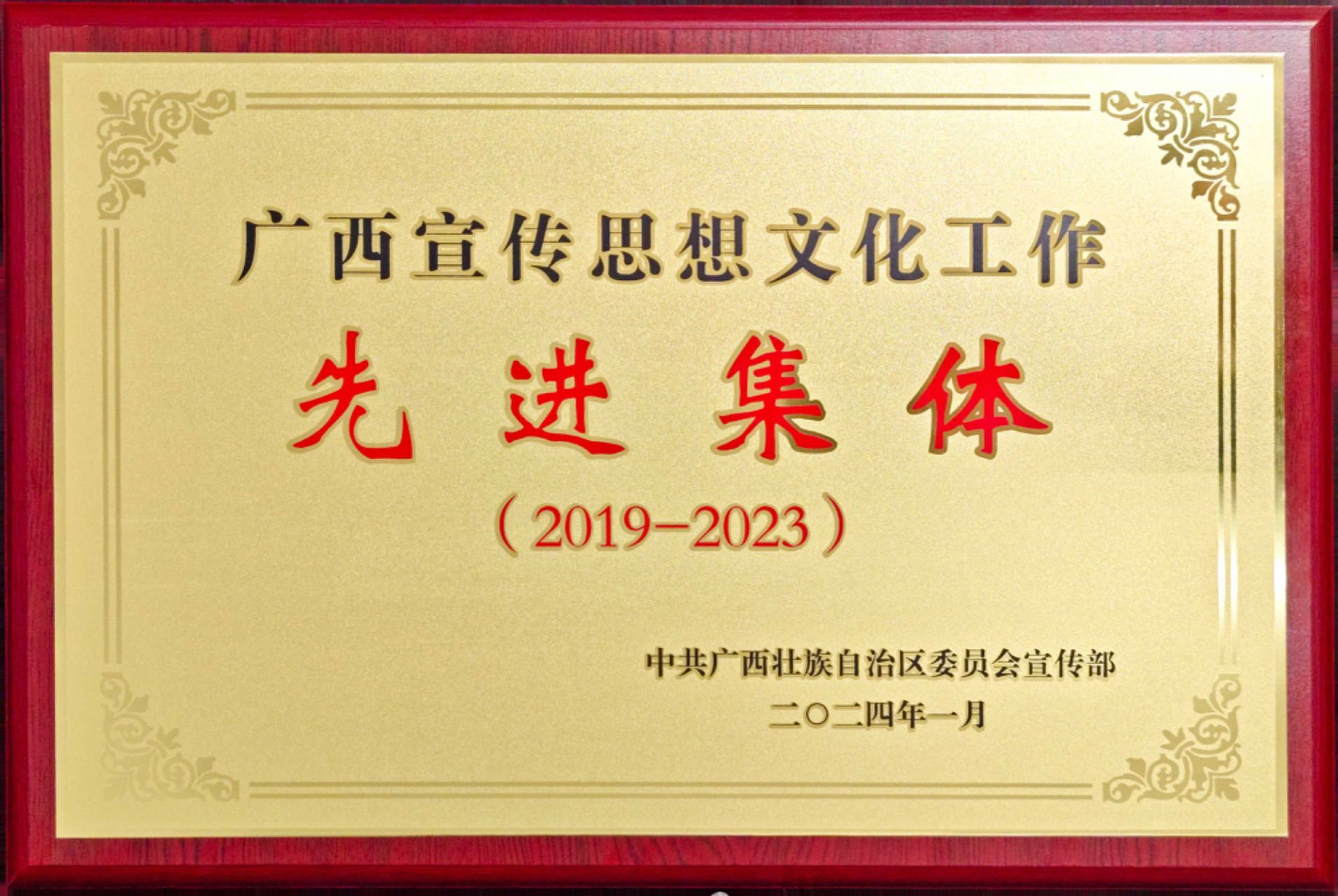 近日,为表彰先进、树立典型,弘扬正气、激励斗志,汇聚起建设新时代壮美广西的磅礴力量,广西壮族自治区党委宣传部决定,授予100个单位“广西宣传思想文化工作先进集体”称号,授予200名个人“广西宣传思想文化工作先进个人”称号。公司太阳集团tyc33455获评“广西宣传思想文化工作先进集体(2019—2023)”。