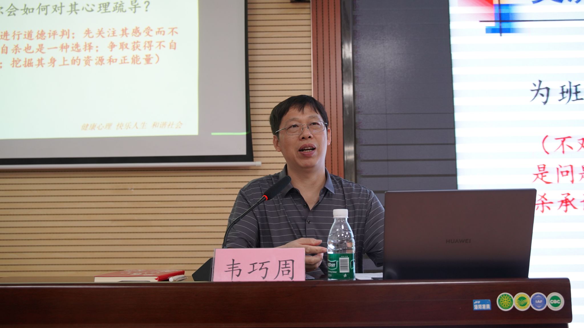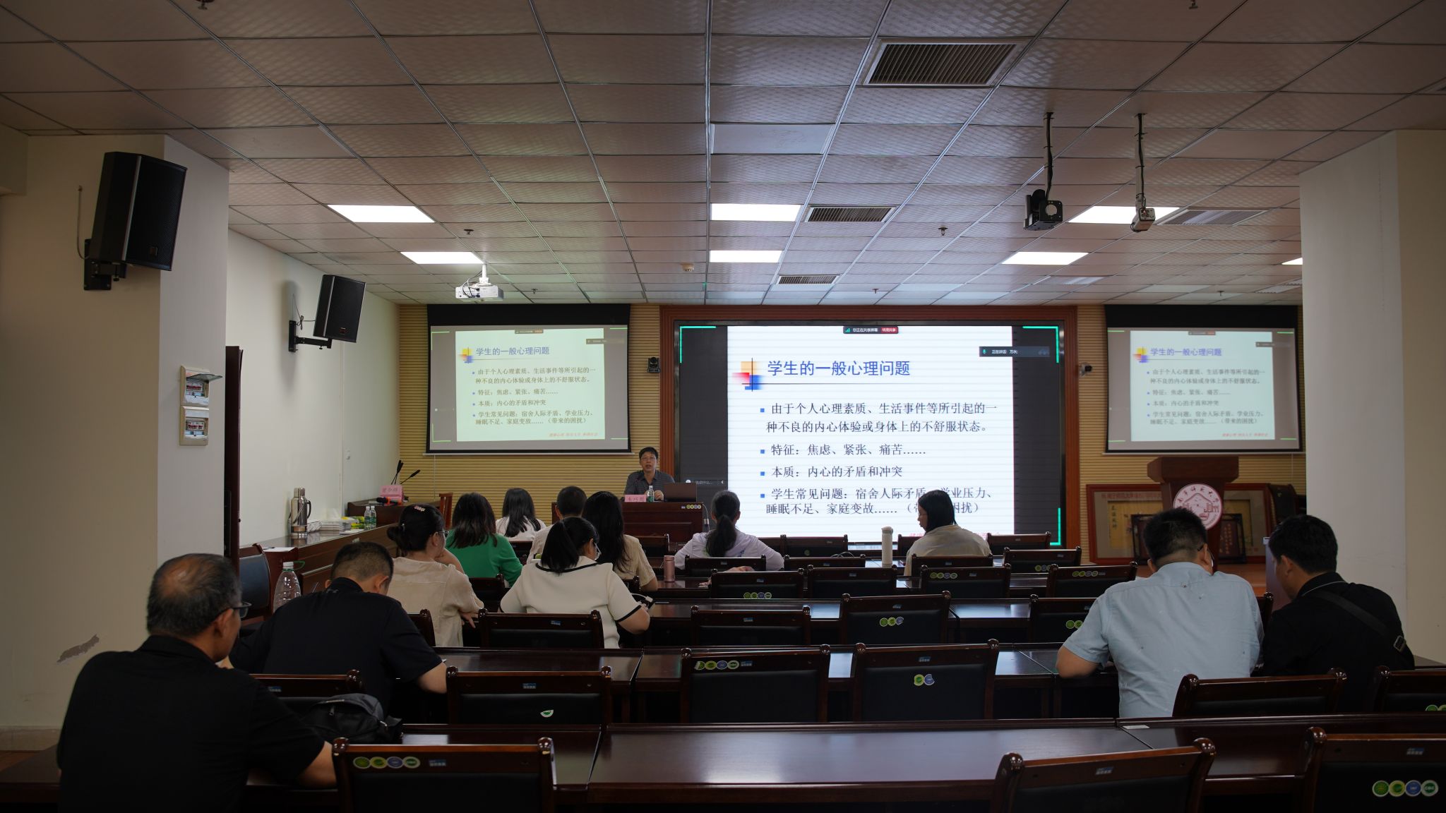 本次专题培训采取“线上”+“线下”同步的方式进行。韦巧周老师结合理论研究和临床实践,从判定不同的心理状态切入主题,从“员工的一般心理问题、解决员工心理问题的基本模式、与员工交流沟通的基本原则、心理异常的识别、导致校园心理危机的常见因素以及常见的心理疾病”等六个方面展开。
