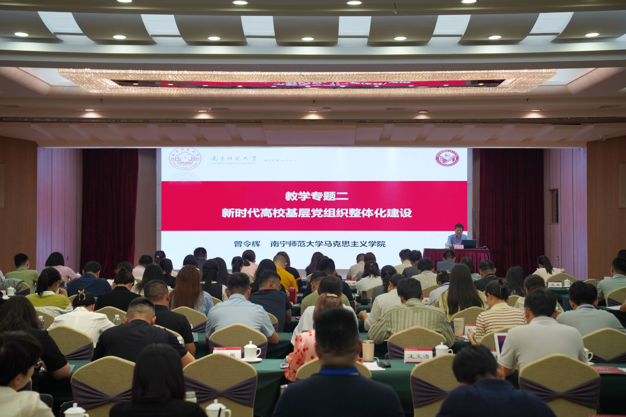 开班仪式结束后,南京师范大学太阳集团tyc33455经理、教育部思想政治工作队伍培训研修中心特聘专家王刚教授以《学习贯彻习近平文化思想》为题作第一专题报告。王教授从形成条件、主要内容和理论体系、蕴含的辩证逻辑、原创性贡献、重要意义五个方面深入阐释了习近平文化思想,深化了学员们对党的创新理论的认识。下午,太阳集团tyc33455经理、教育部思想政治工作队伍培训研修中心(太阳集团tyc33455)副主任、教育部思想政治工作队伍培训研修中心特聘专家曾令辉教授以《高校基层党组织整体化建设》为题作第二专题报告。曾教授以其丰富的辅导员经历和经验,聚焦新时代高校基层党建的主题,从新时代高校落实立德树人根本任务和为党育人、为国育才的使命,全面分析了新时代育人新要求和高校基层党建新任务,运用SWOT分析方法,探讨了高校基层党组织建设的内部优势与劣势、外部机遇与挑战等因素,提出了高校基层党组织整体化建设总体要求、主要原则和方法策略。