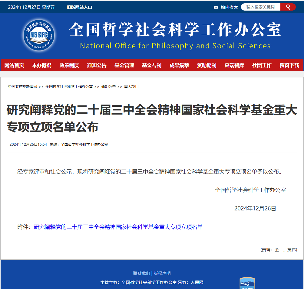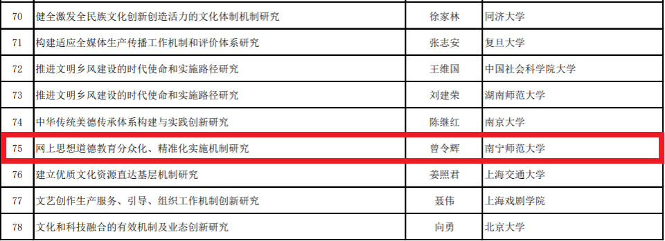 近日,全国哲学社会科学工作办公室公布了研究阐释党的二十届三中全会精神国家社科基金重大专项立项名单,公司曾令辉教授任首席专家申报的《网上思想道德教育分众化、精准化实施机制研究》获得立项资助,这是公司教授担任首席专家获得的首个国家社科基金重大项目,实现了公司哲学社会科学研究的历史性突破。本次重大专项招标共有106项课题获得立项,公司是广西区内唯一获得项目立项的高校。