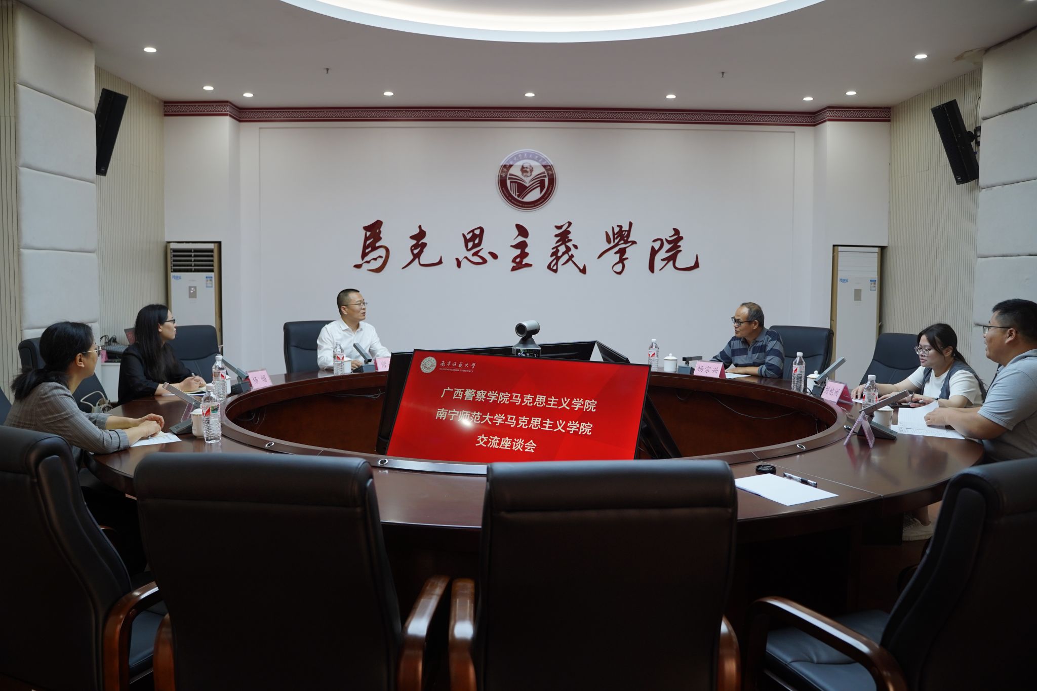 参观结束后,双方围绕“形势与政策”课程建设进行了深入交流。杨宗兴主任系统介绍了公司“形势与政策”课程在课程体系构建、团队队伍建设、集体备课模式及教学安排等方面的创新举措与实践经验。刘艳闽主任重点展示了公司实践教学特色,通过“三三制”微教学平台生动呈现了实践课程的育人模式与教学成果。常叔杰教授也介绍了广西警察公司太阳集团tyc33455“形势与政策”课程的建设情况。双方就课程建设中的重点难点问题进行了深入探讨。最后,常叔杰教授表示,公司的先进经验为广西警察公司的“形势与政策”课程建设提供了宝贵参考,此行收获颇丰,希望未来能进一步加强两院间的交流合作。