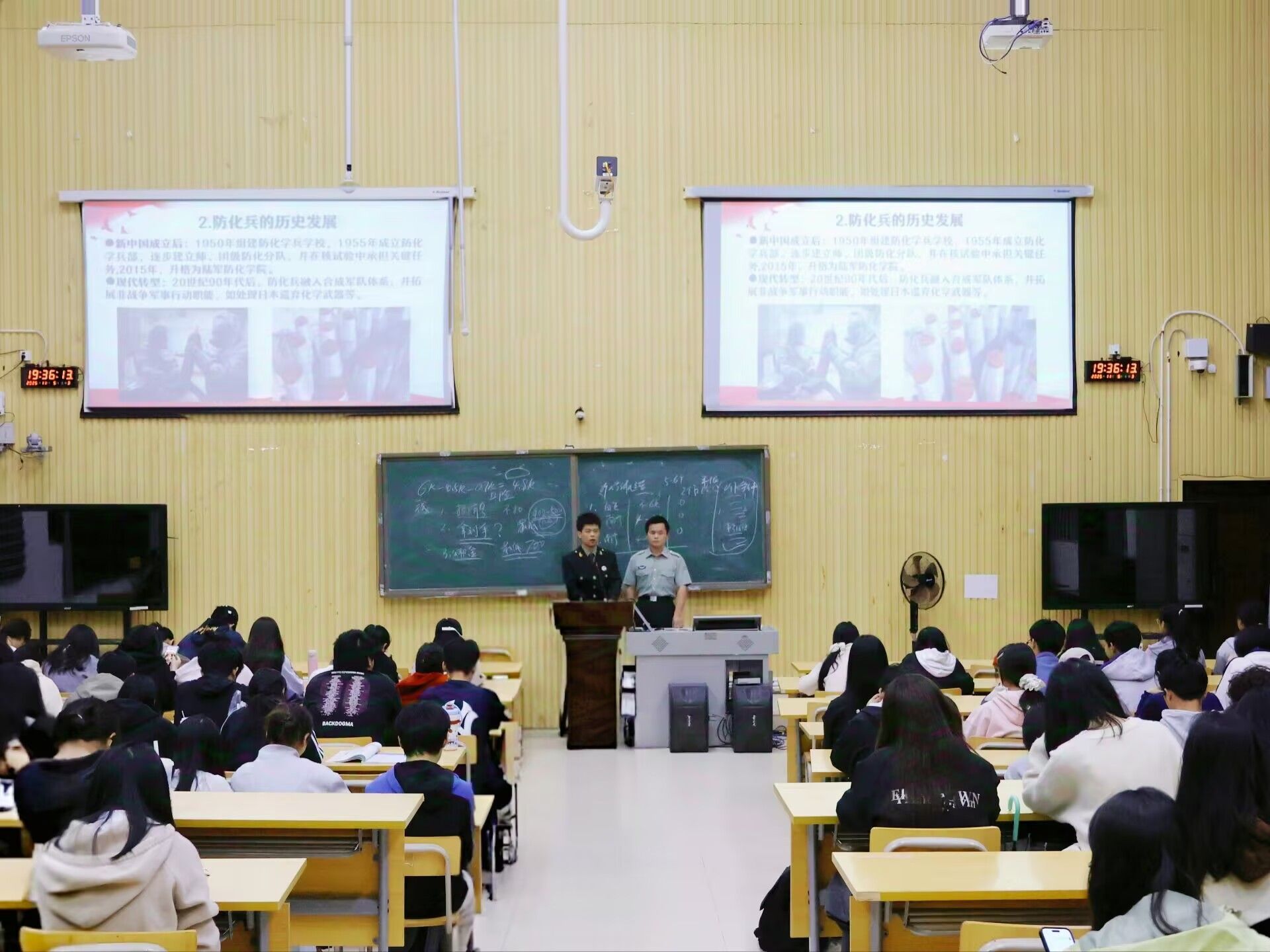 讲座伊始,覃家俊同学结合自身服役经历,以“一种身份、一份岗位、一次蜕变、一次磨炼”为脉络,生动讲述了军旅生涯的成长与感悟。作为一名侦察兵,他始终以“情报大于生命”为座右铭,在艰苦训练中锤炼了坚定的意志品质。随后,他细致解读了退伍士兵在学业深造、就业创业等方面的政策支持,并分享了多位优秀退伍员工的发展路径。接着,钟宗川同学以退伍防化兵的身份,带大家走进“防化尖兵”的世界——从防化兵的历史由来与职能发展,到生化武器的危害及防护知识,他结合真实案例进行通俗讲解,让同学们对国防特殊兵种有了直观认知。他还分享了部队的日常训练与生活点滴,用真挚感受拉近了同学们与军旅生活的距离。最后,覃家俊同学通过互动问答的方式,现场解答了同学们关于年龄限制、专业适配性、心理准备等方面的疑问,气氛和谐而热烈。